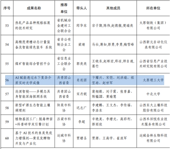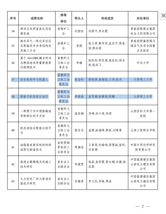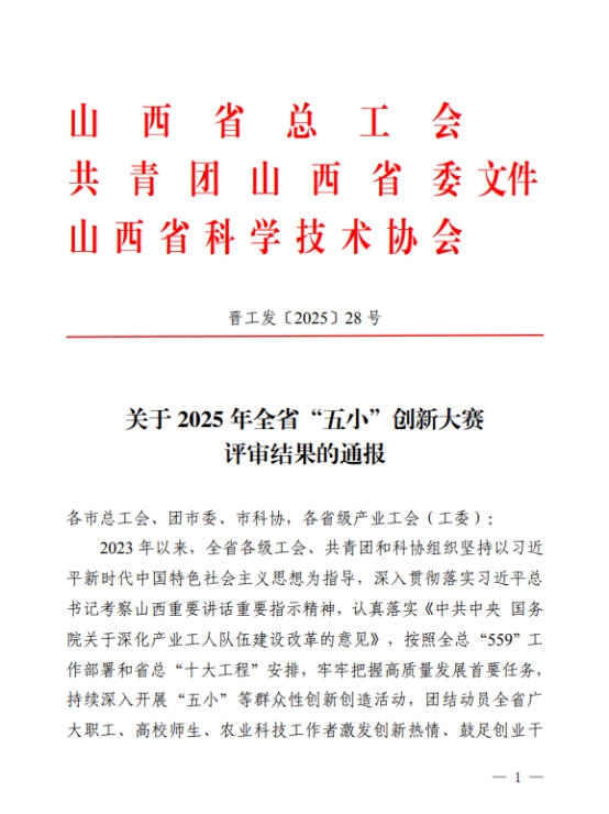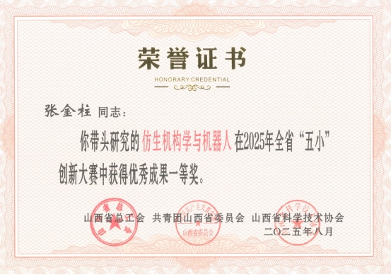 近日,山西省总工会发布了《关于2025年全省“五小”创新大赛评审结果的通报》,我校教职工荣获一等奖3项、二等奖3项、三等奖2项。其中,机械工程学院张金柱等人研究的“仿生机构学与机器人”成果、人工智能学院李晓春等人研究的“智能手机免疫比浊仪”成果、物理与光电工程学院肖连团等人研究的“AI赋能透过水下复杂介质实时光学成像”成果获一等奖,太原理工大学获评“优胜单位”荣誉称号。