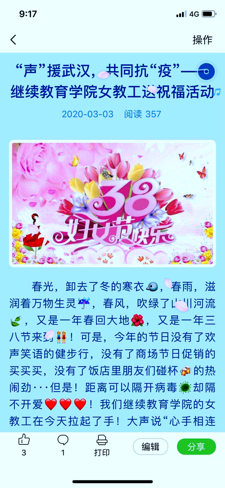 继续教育学院工会在“三八”国际劳动妇女节节到来之日,组织了“声援武汉 共同抗疫”送祝福活动。
