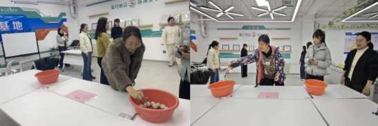 “金豆搬家”夹球赛最是热闹,师生配合用筷子夹起乒乓球快速转移,偶尔球掉落滚远,两人便笑着一同追赶,小小的失误反而让彼此距离更近。