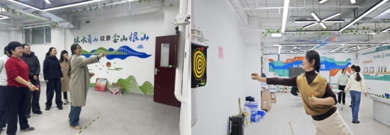 “镖行天下”投掷赛区域前,学生在旁轻声指导站位,教师瞄准靶心、沉稳出手,每一次命中都引来阵阵喝彩。
